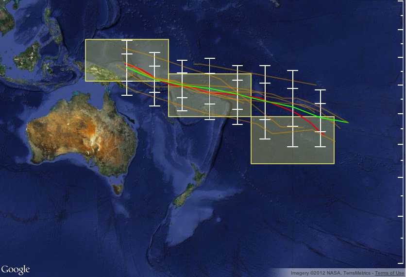 The ensemble of global climate models for rainfall that are used in METPI show an area of higher than normal rainfall associated with the SPCZ position. The green line indicates the average SPCZ position for the forecast period based on the average of 8 climate models. The white vertical bars and ‘whiskers’ indicate the one and two standard deviations between the model projections of the SPCZ position every 5 degrees of longitude.