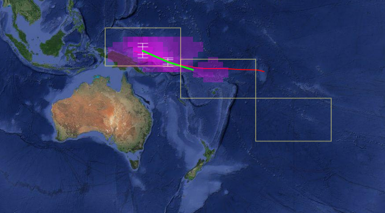 The ensemble of globalclimate models for rainfall that are used in METPI show an area of higher thannormal rainfall associated with the SPCZ position. The green line indicates theaverage SPCZ position for the forecast period based on the average of eightclimate models. The white vertical bars and ‘whiskers’ indicate the one and twostandard deviations between the model projections of the SPCZ positionevery five degrees of longitude. Thepurple shading is proportional to the probability of intense convectiondeveloping within the SPCZ.