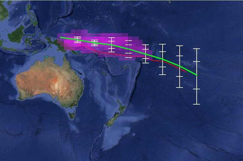 The ensemble of global climate models for rainfall that are used in METPI show an area of higher than normal rainfall associated with the SPCZ position. The green line indicates the average SPCZ position for the forecast period based on the average of eight climate models. The white vertical bars and ‘whiskers’ indicate the one and two standard deviations between the model projections of the SPCZ position every five degrees of longitude. The purple shading is proportional to the probability of intense convection developing within the SPCZ.