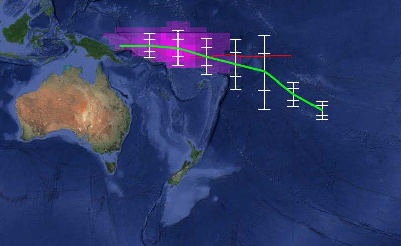 The ensemble of global climate models for rainfall that are used in METPI show an area of higher than normal rainfall associated with the SPCZ position. The green line indicates the average SPCZ position for the forecast period based on the average of eight climate models. The white vertical bars and ‘whiskers’ indicate the one and two standard deviations between the model projections of the SPCZ position every five degrees of longitude. The purple shading is proportional to the probability of intense convection developing within the SPCZ.