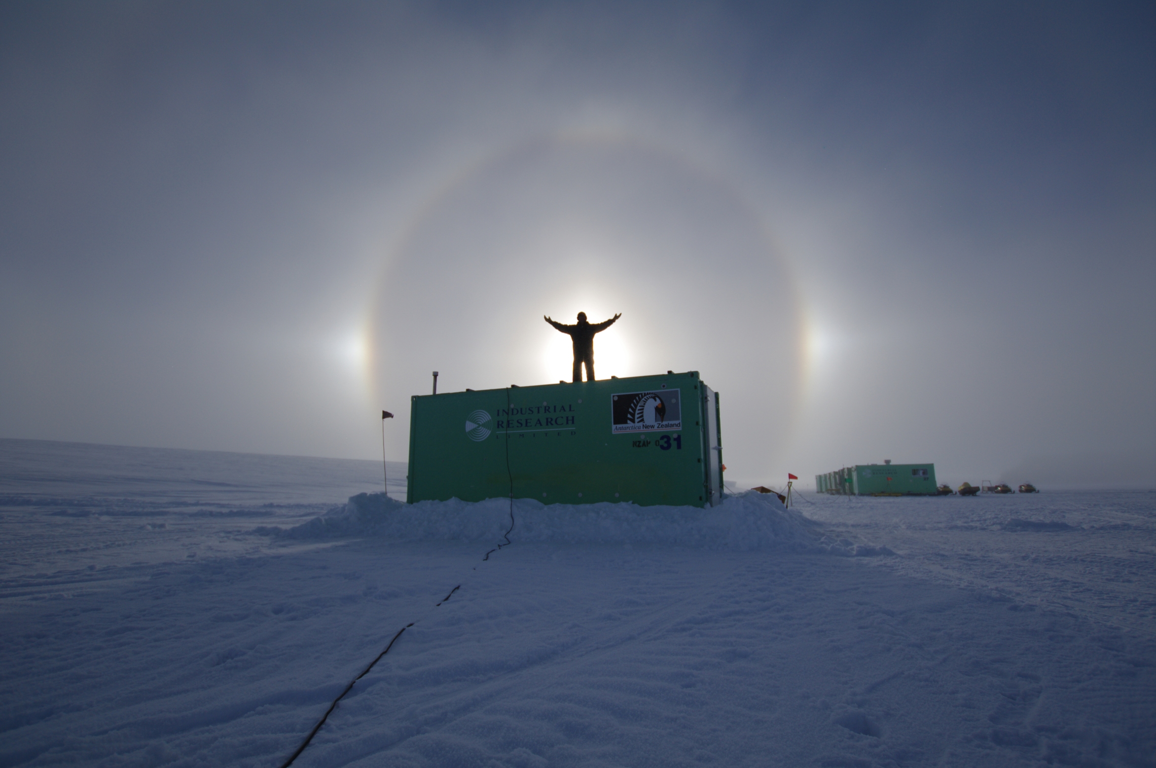 Sundogs form when it gets _really_ cold and the moisture in the air freezes out. The subsequent refraction causes halos. Here Tim Haskell stands on top of Camp K131 near the Erebus Glacier Tongue. Nov 2010.