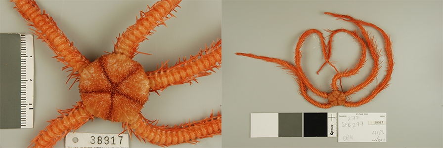 This long spiny-armed brittle star is named Ophiocamax gigas Koehler, 1900, and was collected from 700 m deep on the Admiralty Seamount, just north of the Ross Sea, Antarctica in 2008. This species belongs to the Ophiacanthidae family, which are characterized by their spiny disc plates and arms. ‘Acantha’ means thorn in greek, hence the choice of family name. There are 12 current species in the family, with the gigas species occurring exclusively around Antarctica, south of the Antarctic Convergence from 675-1954 m.