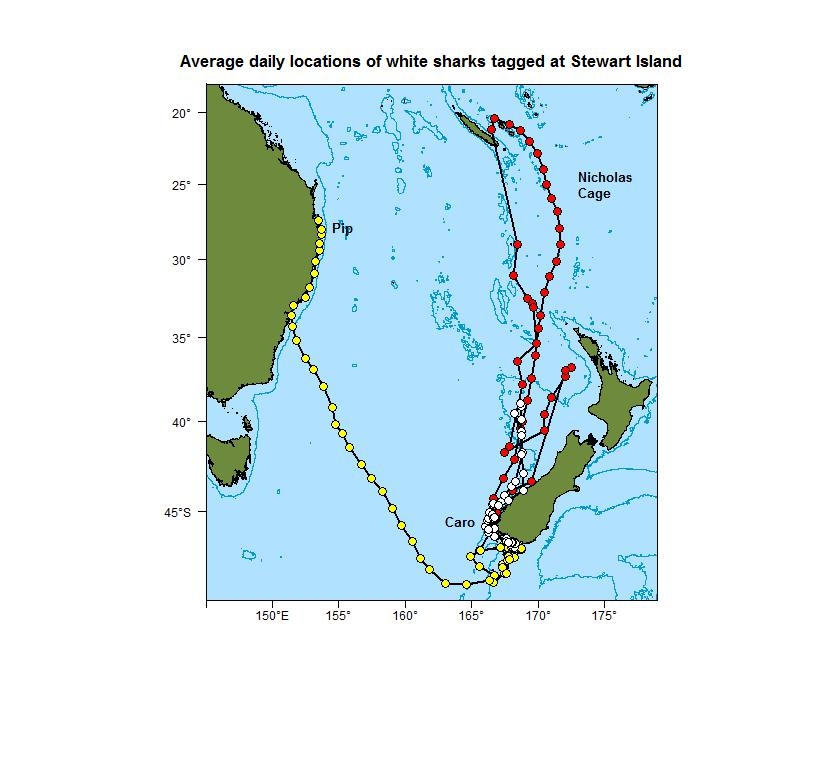 SPOT-tagged white sharks tagged at Stewart Island