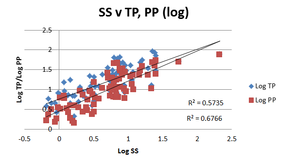 Relationships between suspended sediment and (1) total phosphorus and (2) particulate phosphorus (TP-DRP).