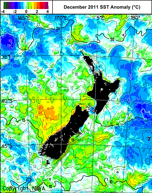 Differences from normal December surface temperatures in the seas around New Zealand.