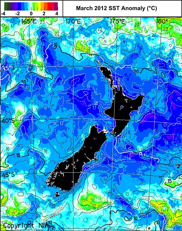 Differences from normal March surface temperatures in the seas around New Zealand.