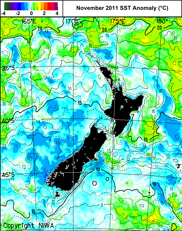 Differences from normal November surface temperatures in the seas around New Zealand.