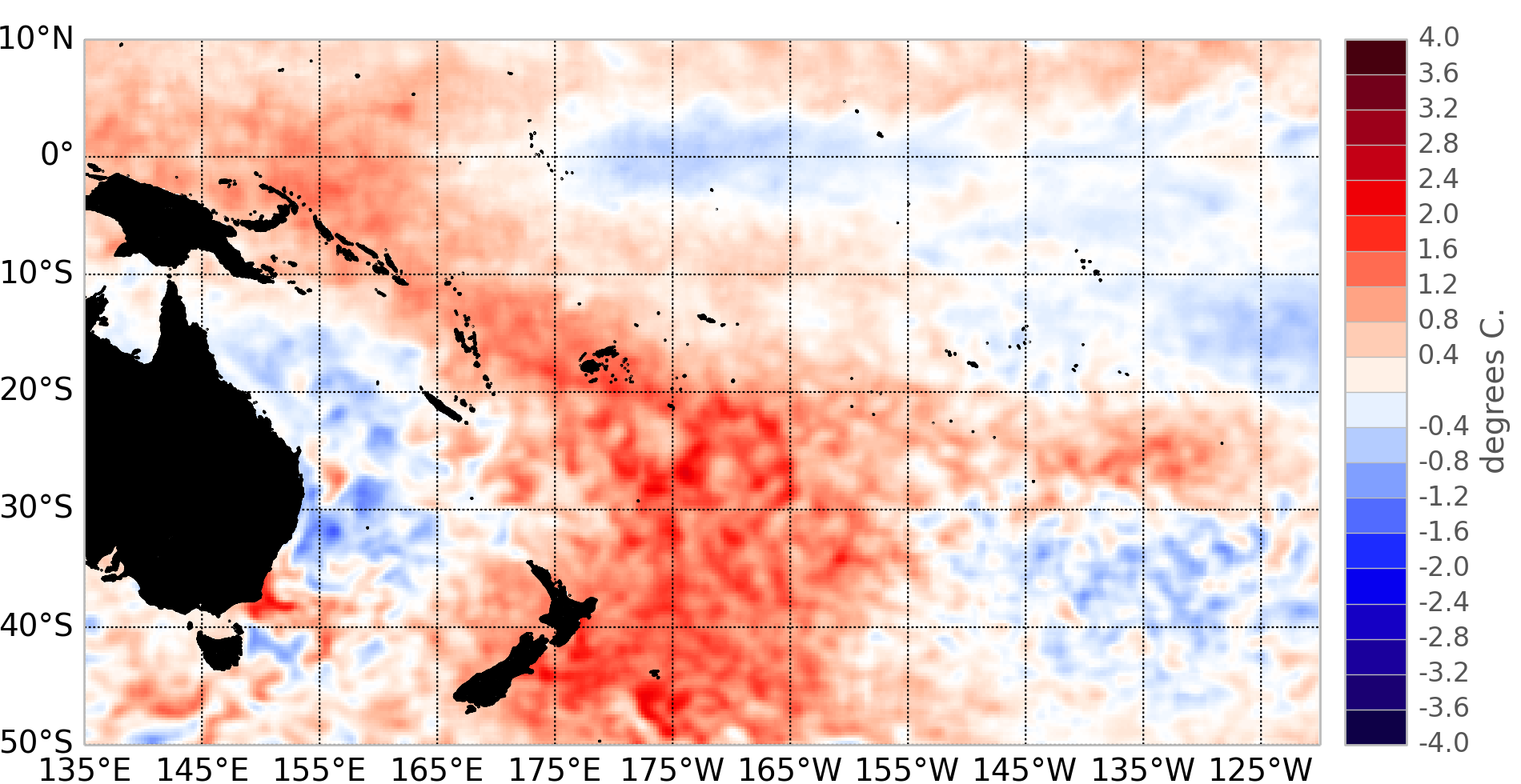 Surface temperature anomalies (ºC) for December 2013, data is from the NOAA OISST Version 2 dataset, available at the NOAA’s Climate Data Center (ftp://ftp.cdc.noaa.gov/Datasets/noaa.oisst.v2.highres/).