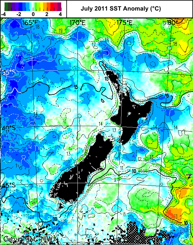 Differences from normal July surface temperatures in the seas around New Zealand.