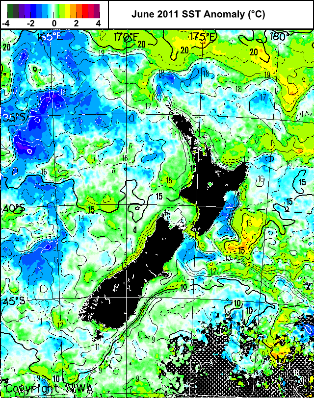 Differences from normal June surface temperatures in the seas around New Zealand.
