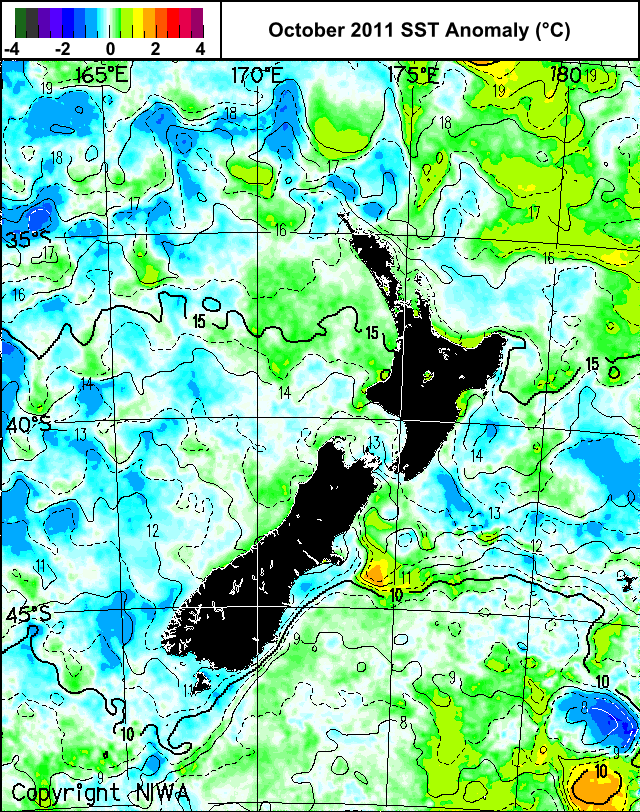 Differences from normal October surface temperatures in the seas around New Zealand.