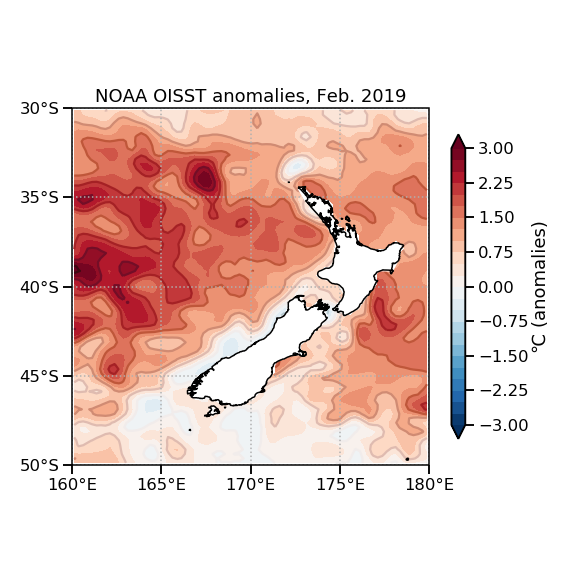 Differences from average February surface temperatures in the seas around New Zealand