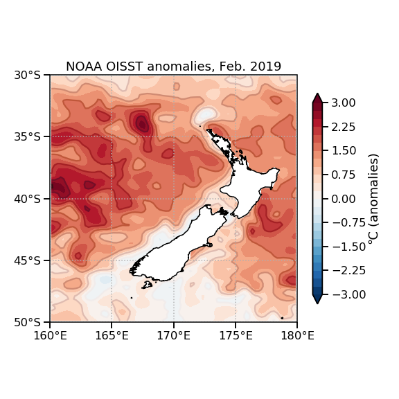 Differences from average Febraury surface temperatures in the seas around New Zealand