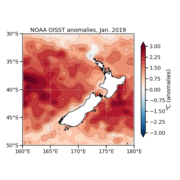 Differences from average January surface temperatures in the seas around New Zealand
