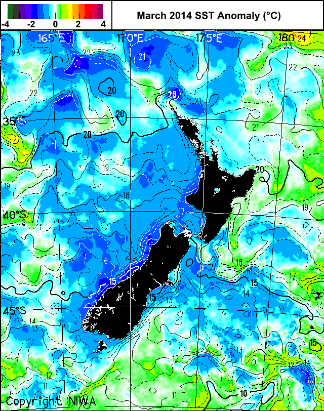 Differences from normal March surface temperatures in the seas around New Zealand.