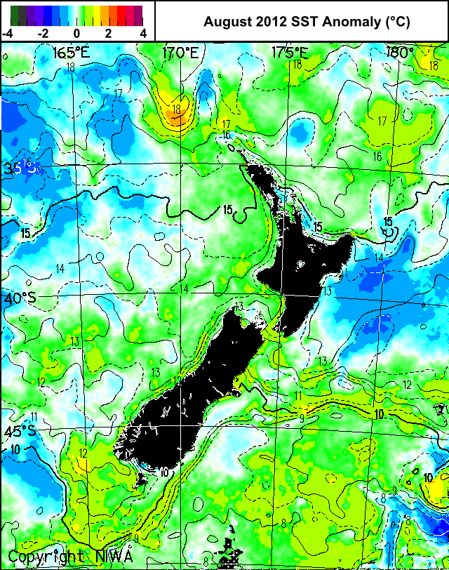 Differences from normal August surface temperatures in the seas around New Zealand.