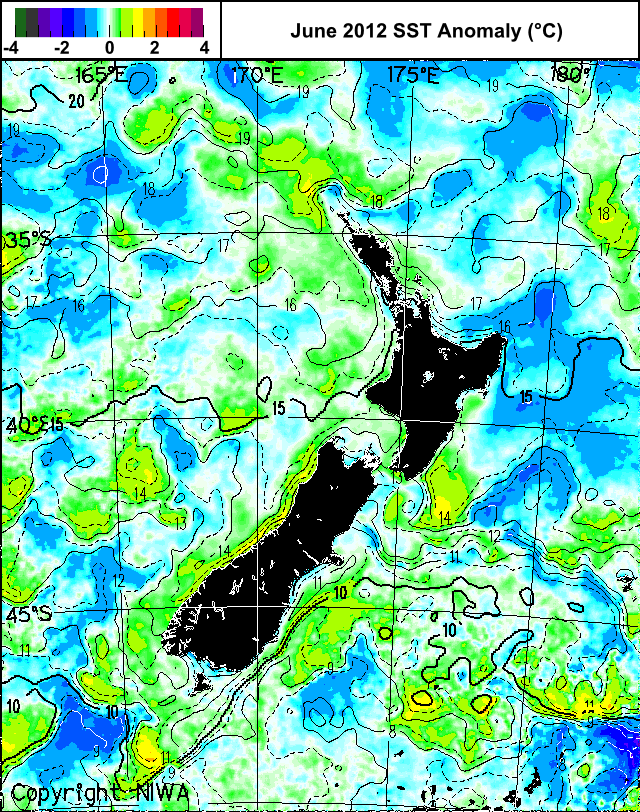 Differences from normal June surface temperatures in the seas around New Zealand.