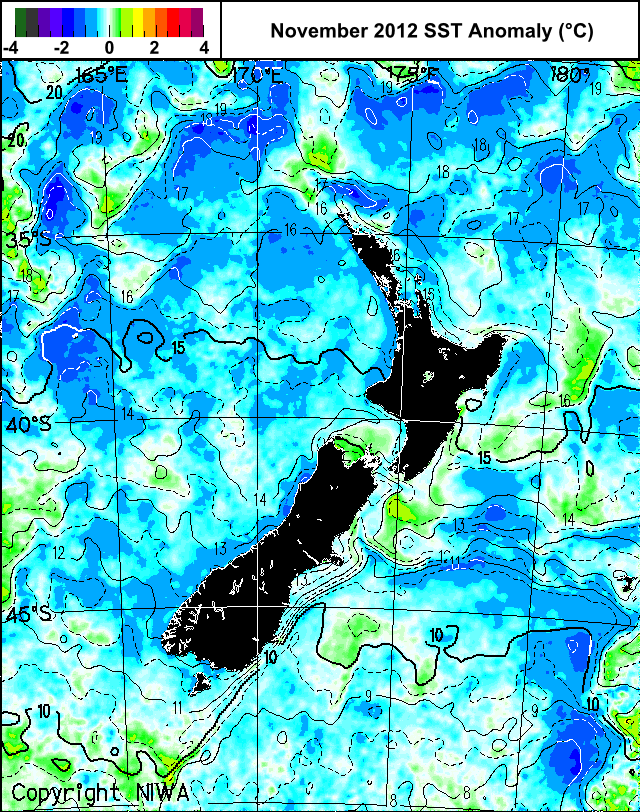 Differences from normal November surface temperatures in the seas around New Zealand.