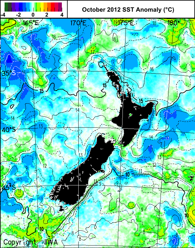 Differences from normal October surface temperatures in the seas around New Zealand.
