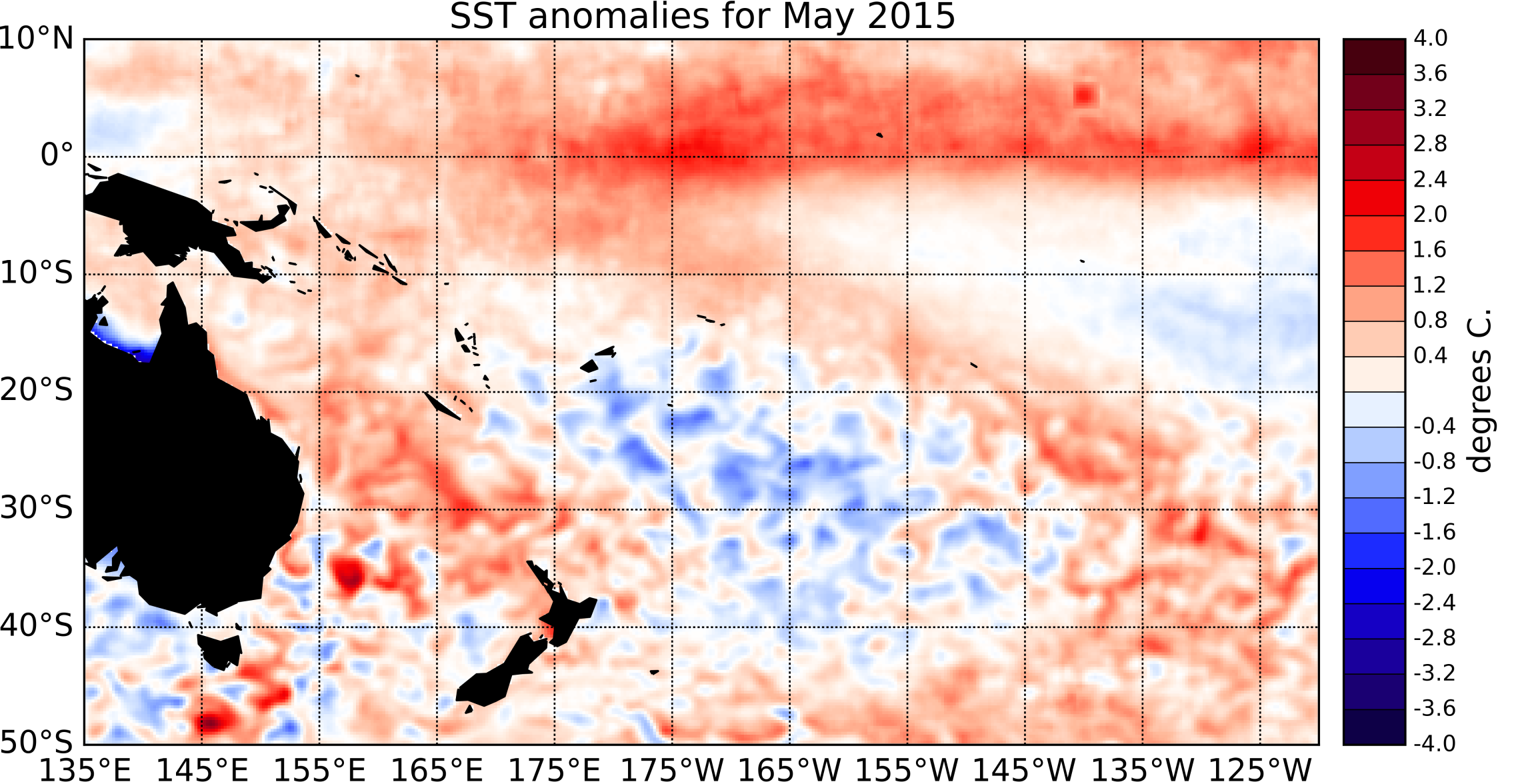 Surface temperature anomalies (ºC) for May 2015, data is from the NOAA OISST Version 2 dataset, available at the NOAA’s Climate Data Center (ftp://ftp.cdc.noaa.gov/Datasets/noaa.oisst.v2.highres/).
