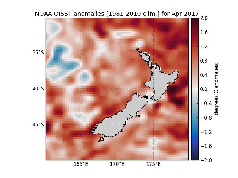 Differences from average April surface temperatures in the seas around New Zealand