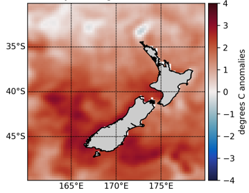 Differences from average February surface temperatures in the seas around New Zealand