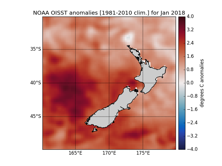 Differences from average January surface temperatures in the seas around New Zealand