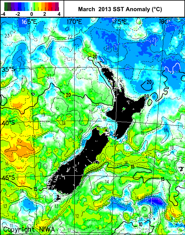 Differences from normal March surface temperatures in the seas around New Zealand.