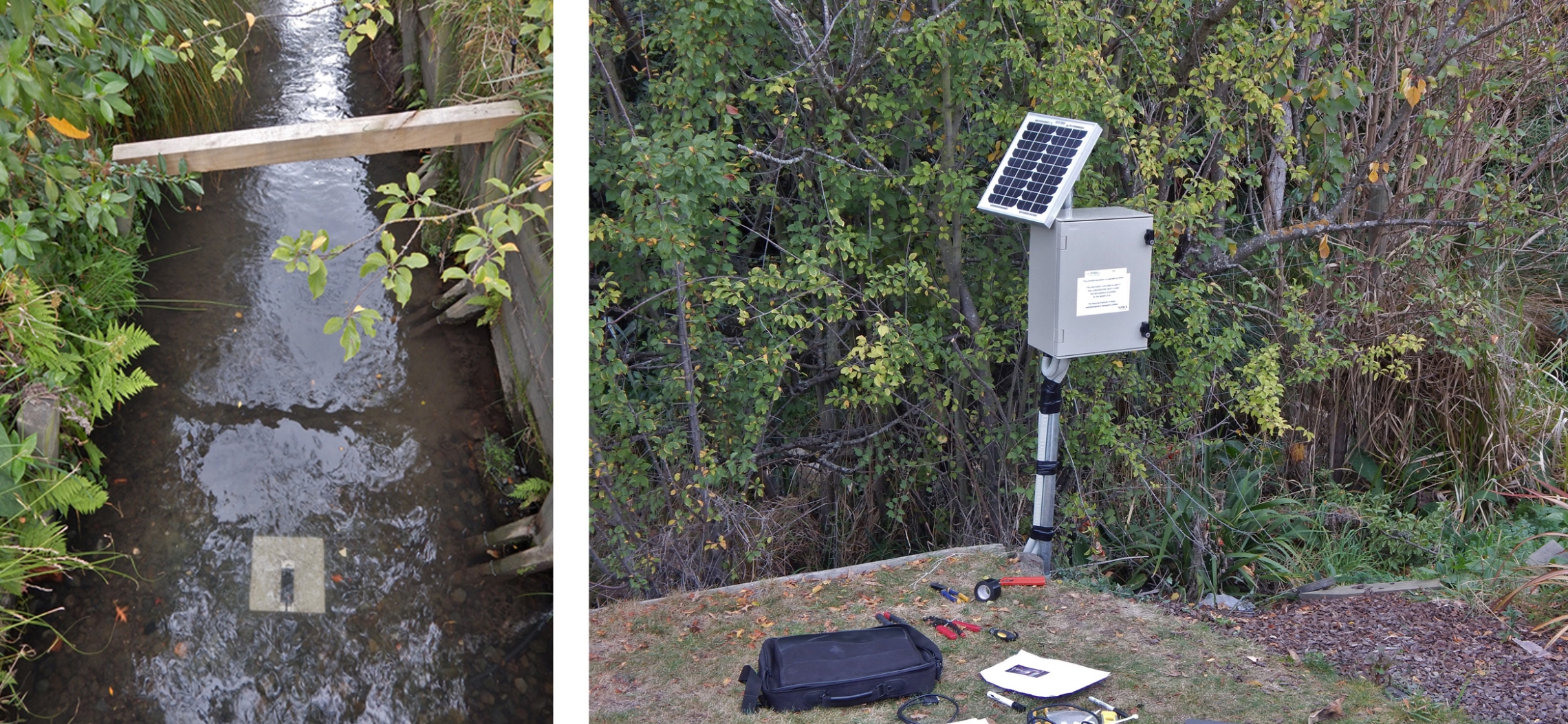 Left: The solar-powered monitoring station on Dudley Creek. Right: A Starflow, mounted in the creek bed, measures water velocity, depth and temperature. [Photos: NIWA]