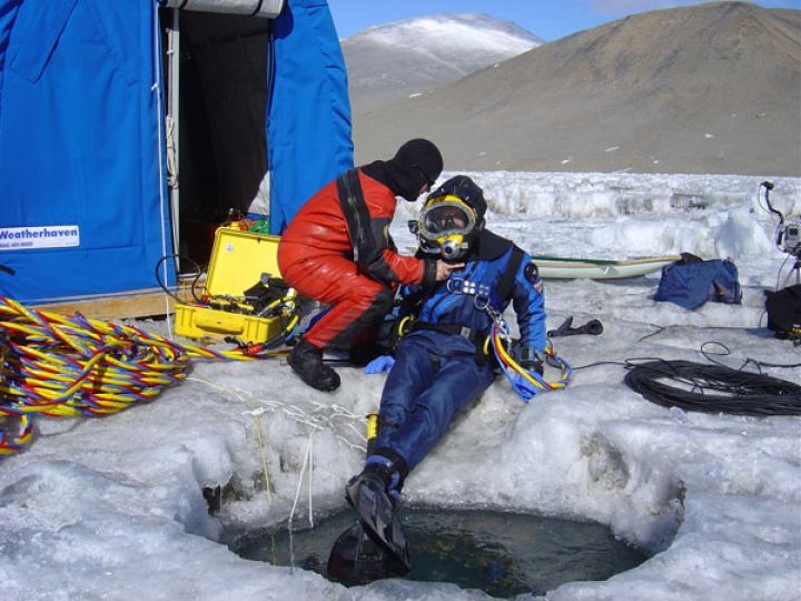 Ian Hawes (in blue) prepares to go under the ice at Lake Hoare, aided by standby diver Robin Ellwood (a teacher at Rye Junior High School in New Hampshire).
