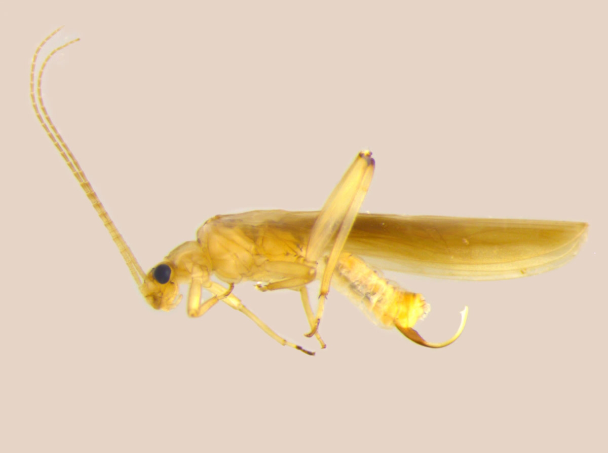 Figure 2: Female stonefly (Haltoperla viridans) showing the ovipositor beneath the abdomen. [Photo: Brian Smith]