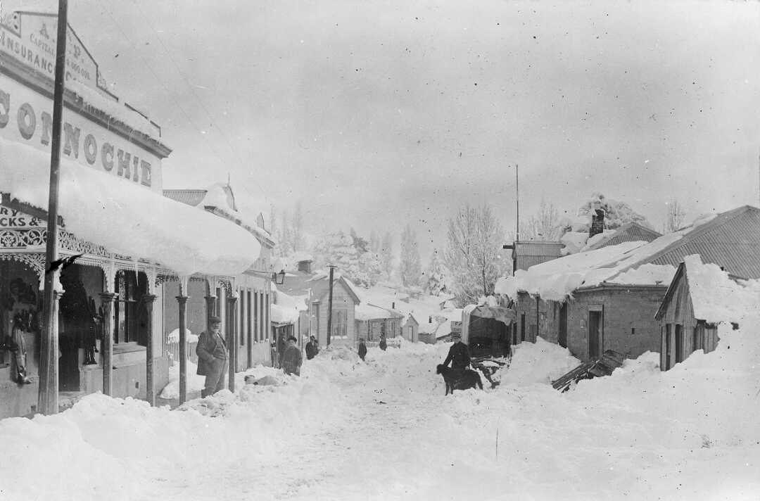 Street scene in snow, St Bathans, Central Otago, photographed in July 1903 by F M Pyle.