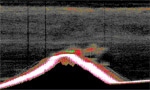A strong concentration of echoes from a school of fish above a seamount at 920 m depth. The white band is the seafloor.