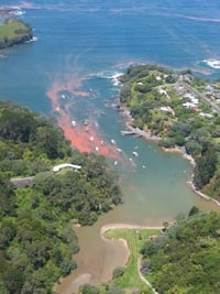 Stunning red tides can be seen clearly in this aerial photo taken near Langs Beach on the east coast between Auckland and Whangarei on 1 December 2002. (Photo: Miriam Godfrey)