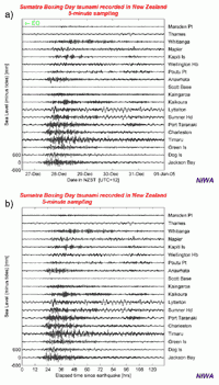Sumatra tsunami recorded at 5-minute sampling intervals at 19 sites: a) Date/time in NZ Standard Time (UTC+12), with earthquake (EQ) time shown, b) Elapsed time in hours since the earthquake occurred.