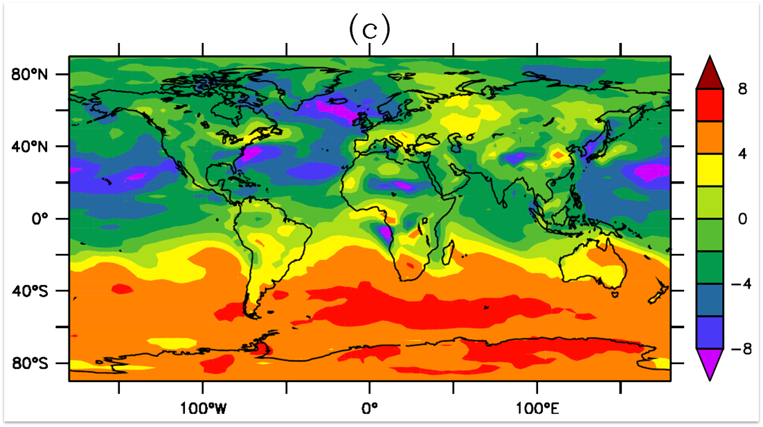 June-July-August mean increase in surface ozone in 2100, relative to 2000 (in parts per billion by volume, from Zeng et al., Geophys. Res. Lett., 2010). Click to enlarge