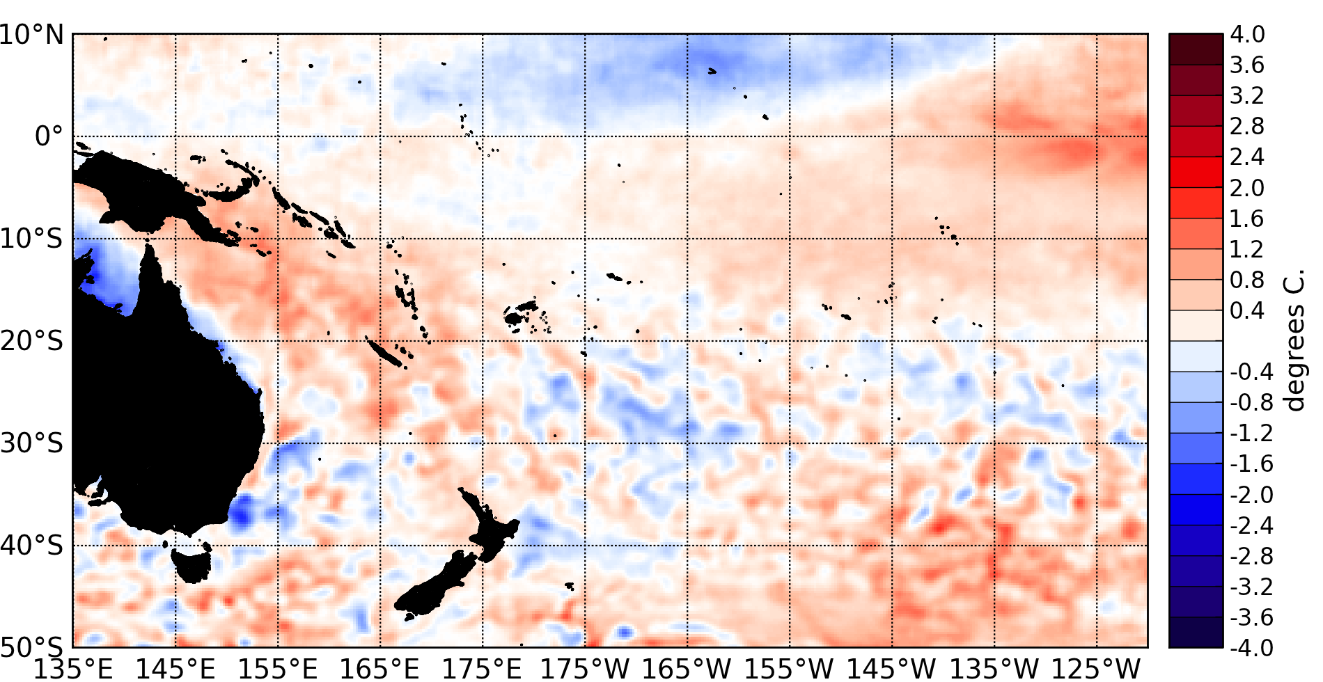 Surface temperature anomalies (°C) for July 2012, data is from the NOAA OISST Version 2 dataset, available at the CDC