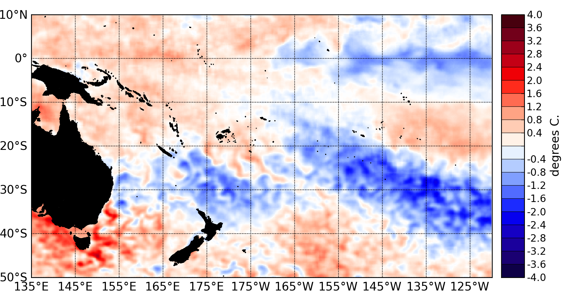 Surface temperature anomalies (ºC) for February 2013, data is from the NOAA OISST Version 2 dataset, available at the NOAA’s Climate Data Center (ftp.cdc.noaa.gov/Datasets/noaa.oisst.v2.highres).