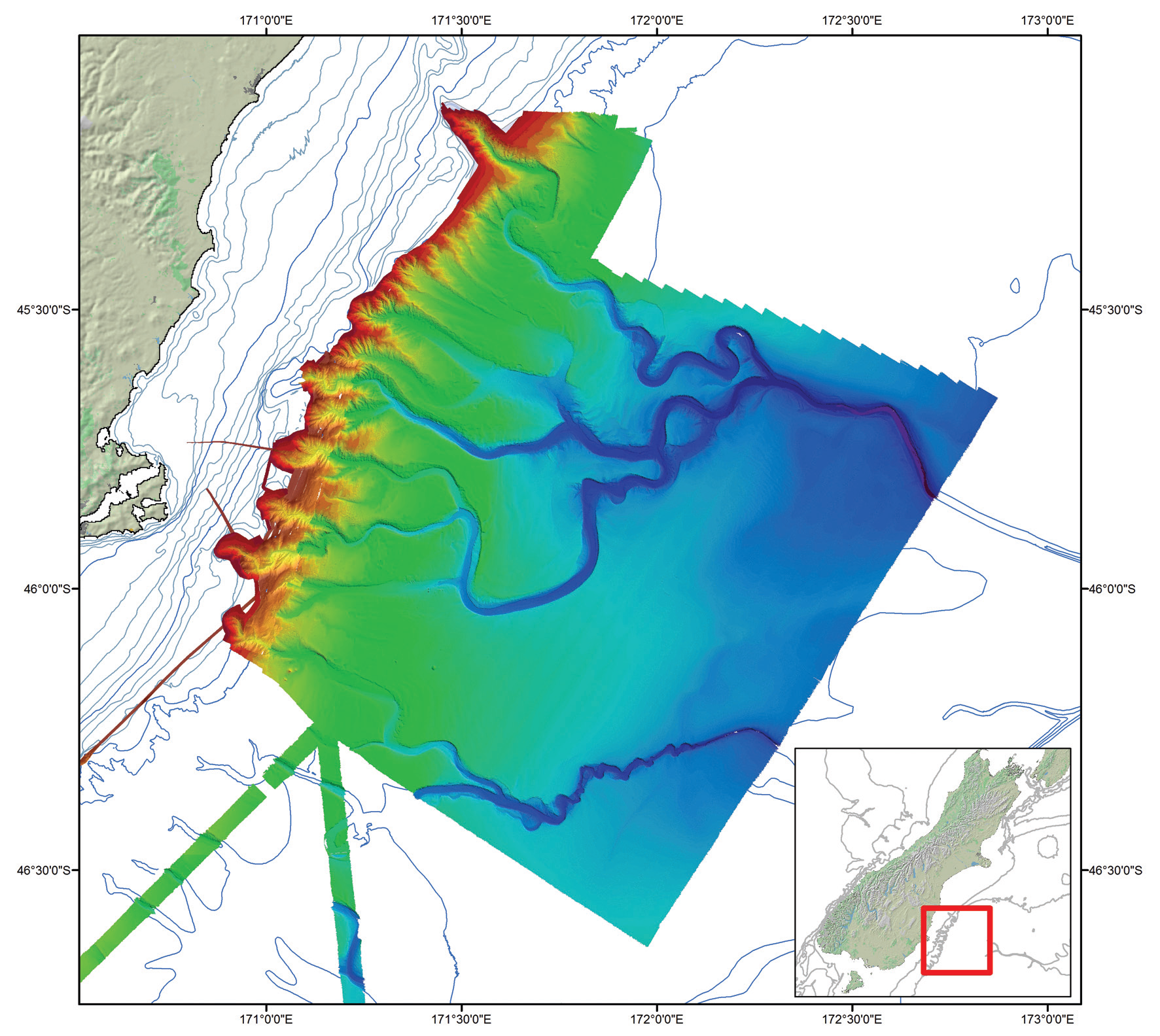 Survey coverage of part of the Otago Canyon complex, offshore East Coast, South Island, extending from Waitaki Canyon in the north to Hooper's Canyon in the south. Image is a sun-illuminated digital elevation model. Depth range 100m (red) to 2000m (purple).