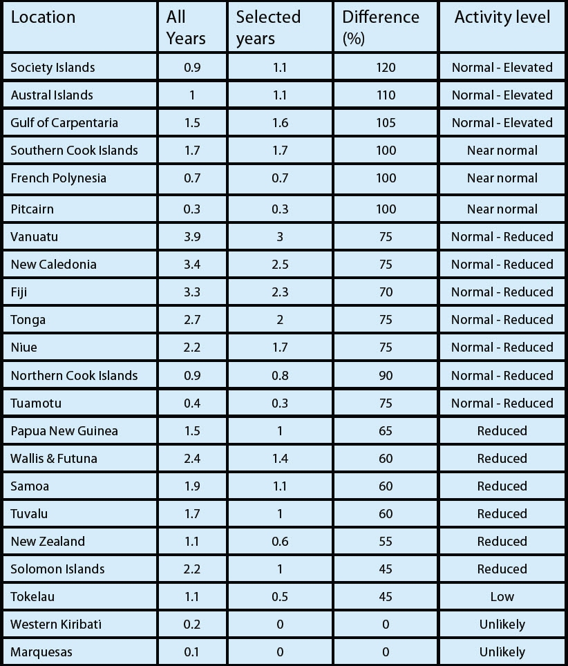 Average number of TCs passing within 5° of the main island groups between November - April. Activity level (and associated risk) are indicative of how many storms might be expected for any given island group for the current season.