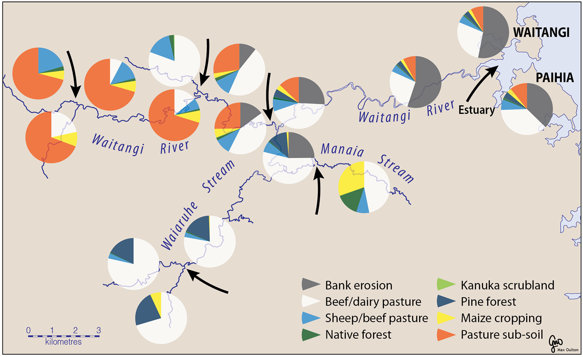 Figure 3: Proportional sediment contributions (%) by land use for tributaries and main reaches at confluences of the Waitangi River Catchment, Northland (2014). The results show a progressive shift from soil erosion sources in the upper catchment to river-bank erosion in the lower catchment. Major land use sources of sediment are soils eroded from pastoral agriculture. These estimates are based on CSSI analysis of recent sediment deposits sampled from the river bed and/or banks. [Source: Northland Regional Council funded study of contemporary sediment sources in the Waitangi River catchment.]