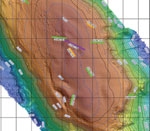 Swath map of Young Nicks Seamount shows a mountain rising 1300 m from the seafloor, yet lying almost a kilometre below the surface.