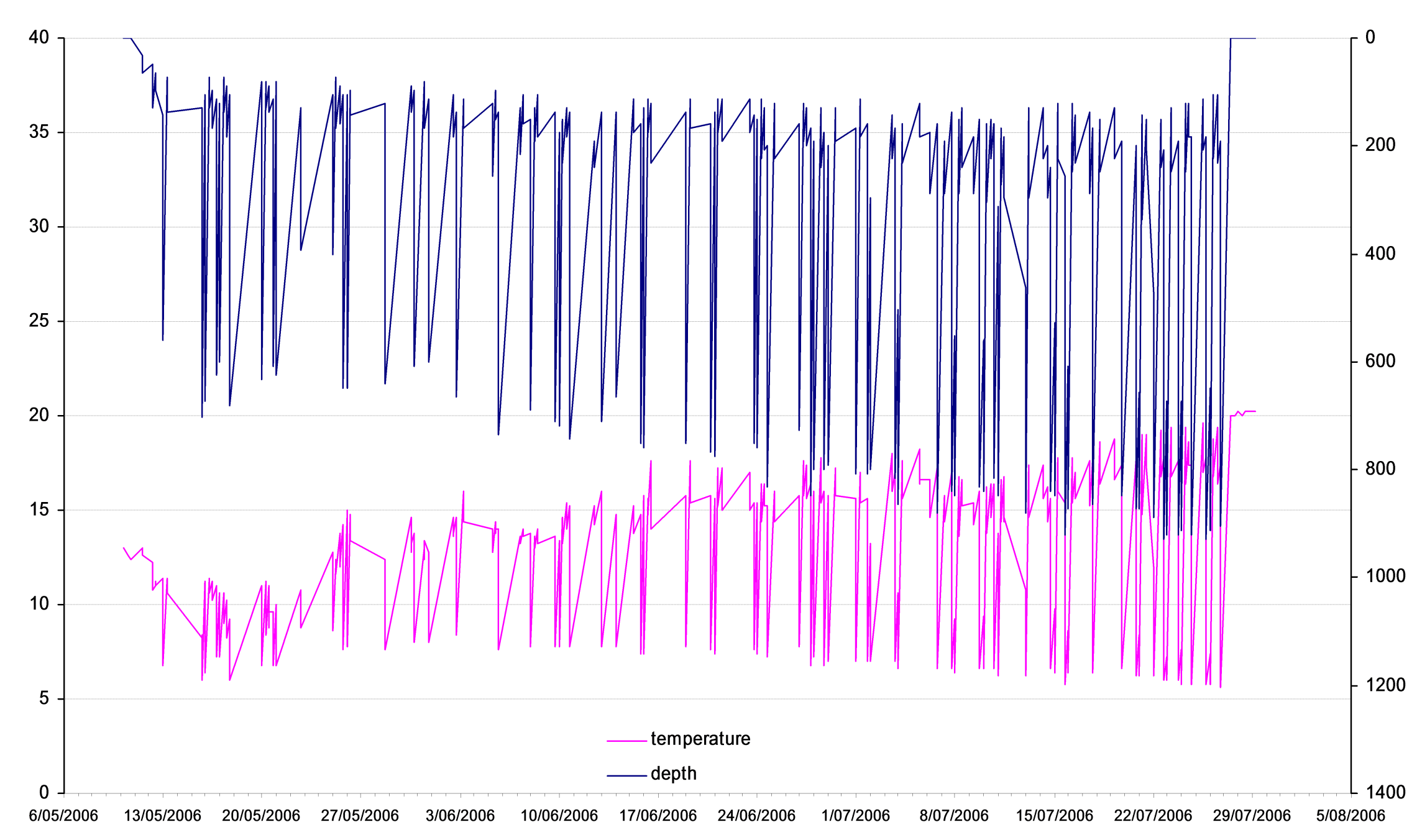 This graph shows the swimming depth (in m, right Y axis, blue line) and temperature (in °C, left Y axis, pink line) experienced by one migrant longfin eel during it's ocean journey. Credit: Don Jellyman