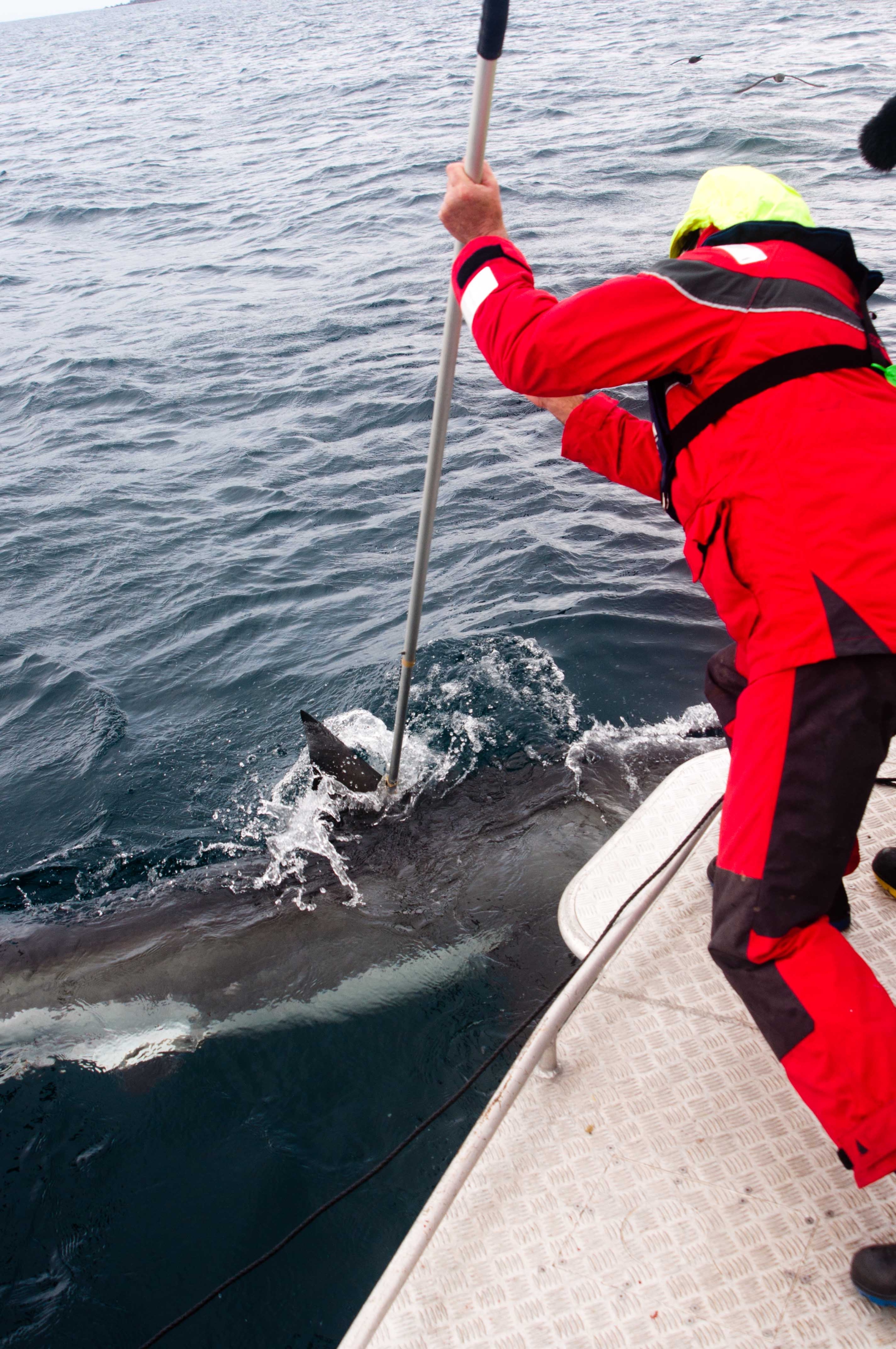 NIWA scientist Malcolm Francis tagging white shark with acoustic tag.