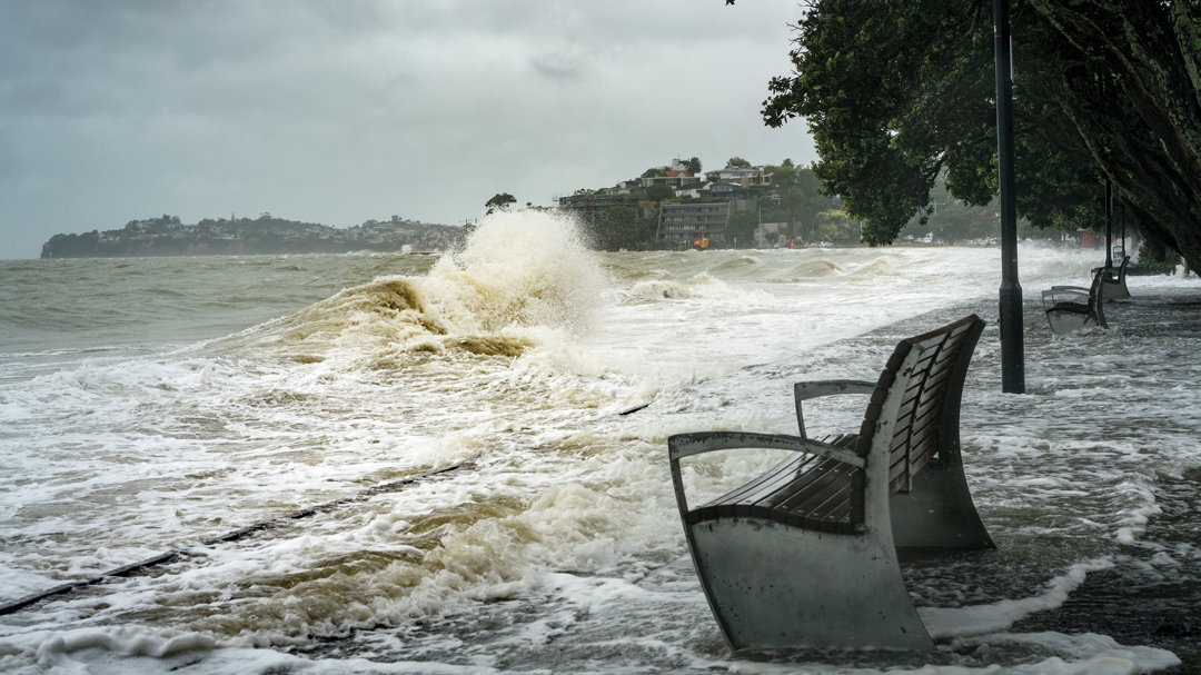 Flooding along Auckland's Tamaki Drive on 5 January 2018, as storm and king tides meet.