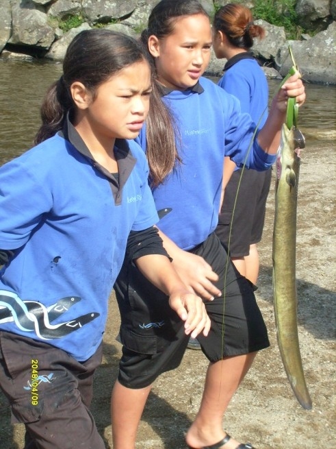 Tamariki from Moerewa School helping out with a tuna survey at Tiria Falls in the Taumārere River catchment. Credit: Norma Cooper