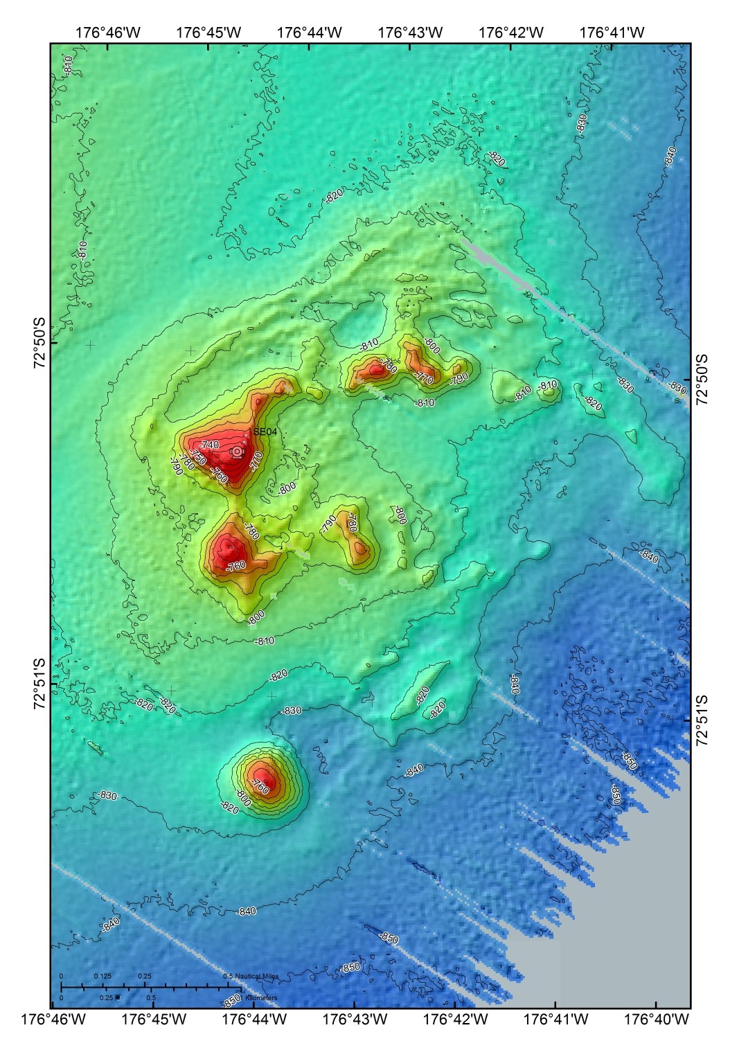 A map produced by Arne Pallentin from newly collected multibeam data of a small hill feature on the south eastern slope of Iselin Bank in the Ross Sea. The point on the top of the hill shows where we deployed the DTIS.
