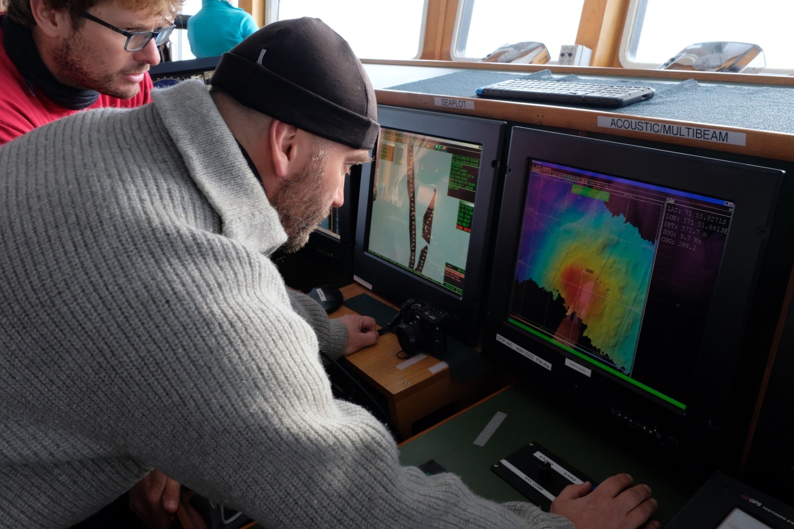 Arne Pallentin and Yoann Ladroit, both of NIWA, planning the next multibeam lines to take.