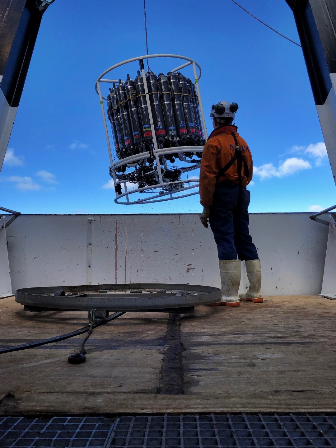 The CTD being recovered after one of the CTD casts along the transect across the Southland Current off south Otago.