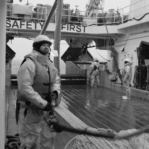 Tangaroa crewman Phil Bignell helping haul the fish trawl.
